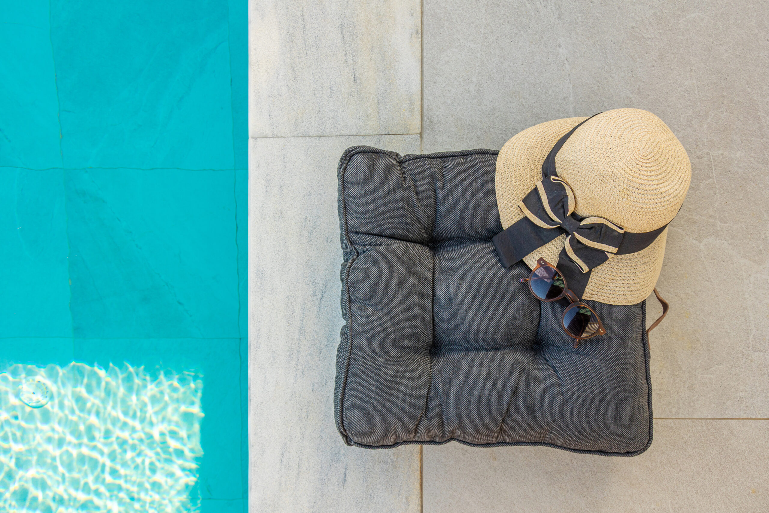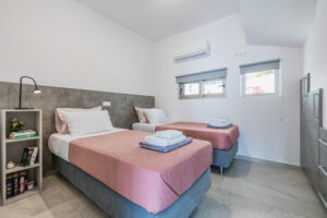 Cozy bedroom with two single beds, main bathroom, fully equipped kitchen, and a living room opening directly to the outdoor pool area.