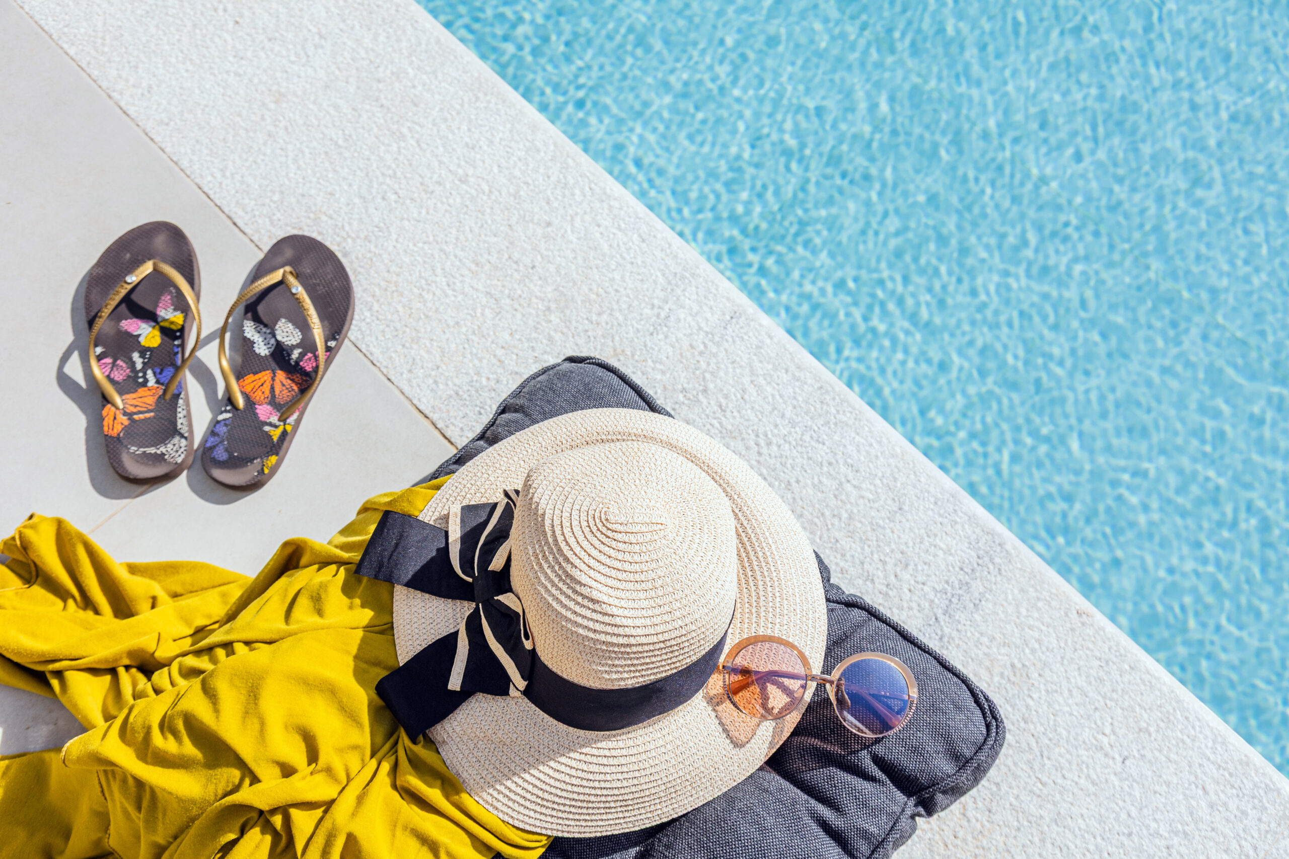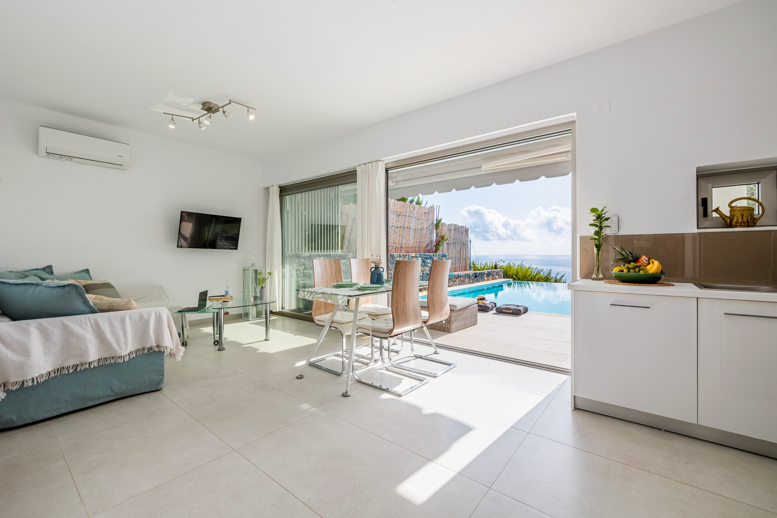 Cozy bedroom with two single beds, main bathroom, fully equipped kitchen, and a living room opening directly to the outdoor pool area.